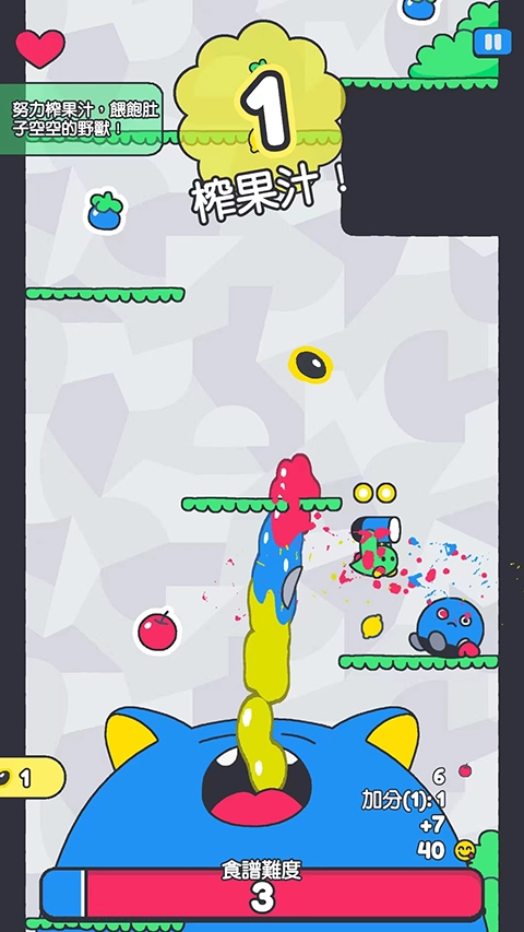 基礎操作方面,下滑屏幕能讓角色跳躍,左右滑動則可調整移動方向;在空中按壓屏幕,角色會向下重擊并快速降落;當獲取跳跳球后,就能實現空中二連跳,從而增強機動性。 果汁投喂的規則是,收集沿途的水果,通過重擊地面將其榨成果汁,然后喂給持續上升的藍色巨獸,以此避免被它吞噬;水果作為核心資源,會直接影響玩家的存活時間。 能力與道具系統中,玩家可以解鎖章魚(具備吸食水果的能力)、蝸牛時鐘(能夠延長跳躍時間)等特殊能力,合理搭配使用這些能力可以幫助突破關卡難點;部分道具像跳跳球,還能解鎖二連跳這類進階操作。 模式解鎖的條件為,完成主線關卡后會解鎖無盡模式;而找到隱藏區域則可以開啟高難度的解謎模式,進一步豐富游戲的玩法維度。 關卡與成長設計上,關卡采用多層垂直結構,隨著高度的提升會解鎖新的區域,每個區域都有獨特的地形和敵人;收集資源可以升級自身能力,進而提高通關的效率。