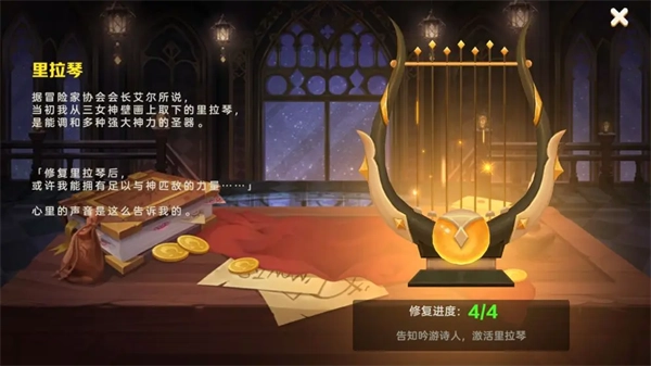 冒險者們完成主線【第4節 修復里拉琴】后,就能拿到里拉琴的最后一塊碎片,從而完成【里拉琴】的修復工作。