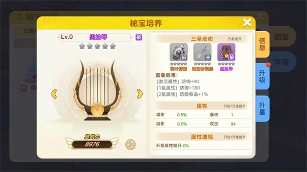 選擇【里拉琴】,可以看到該【秘寶】擁有的三圣庇佑、屬性及屬性增幅。