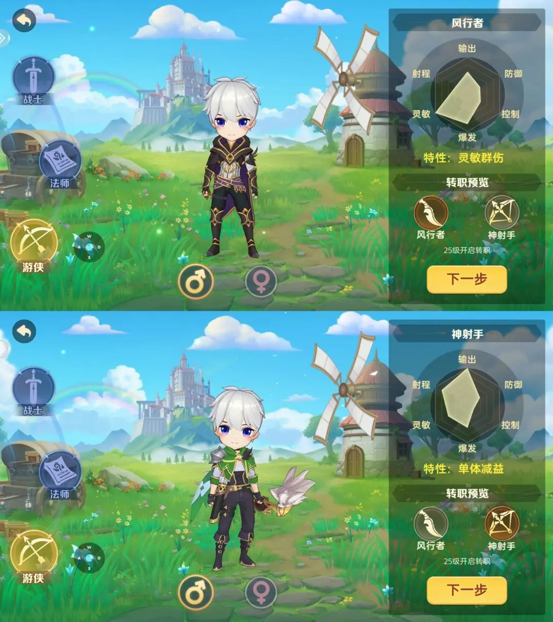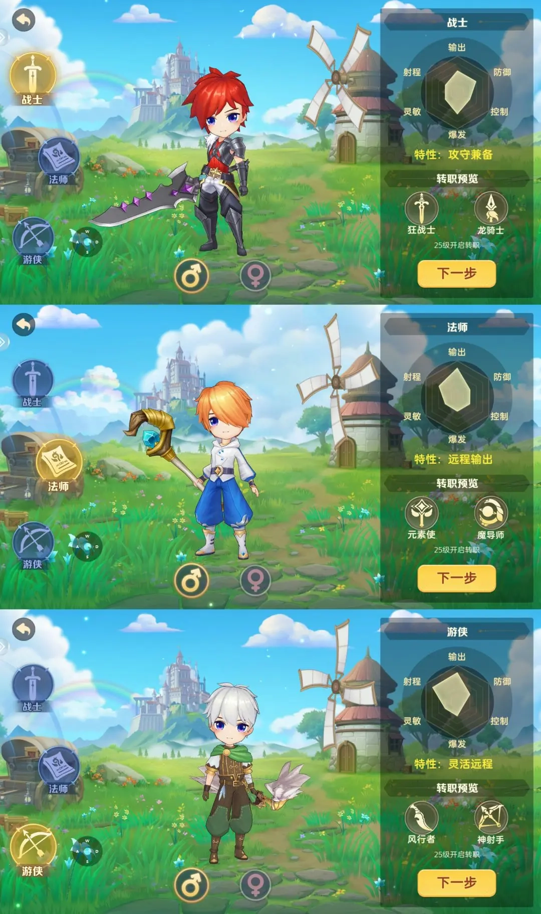 不同職業具備各異的職業特性:戰士屬性相對均衡,能攻能守;法師偏向控制,是遠程輸出型角色;游俠則屬于物理遠程輸出,擁有更遠的射程。