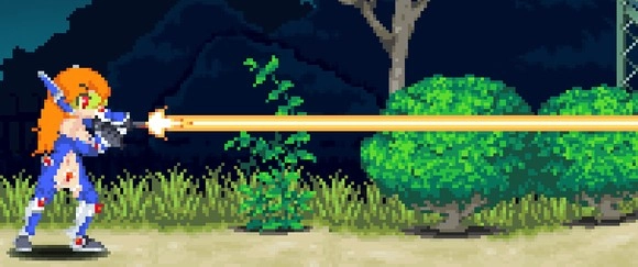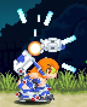 空中攻擊轉刀,米莉亞空戰的精髓,范圍超大,一次轉刀可打出2次判定,配合米莉亞空中可跳6次每跳一下一個轉刀簡直酸爽,也可以一邊跳一邊大范圍的移動防止被怪圍