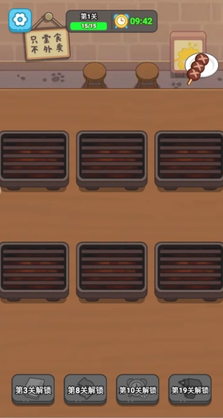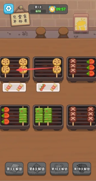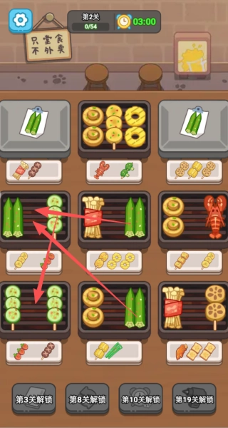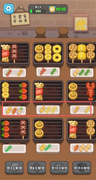 2、每關(guān)需在步數(shù)限制內(nèi)完成特定烤串訂單,全部放置在一起才行。