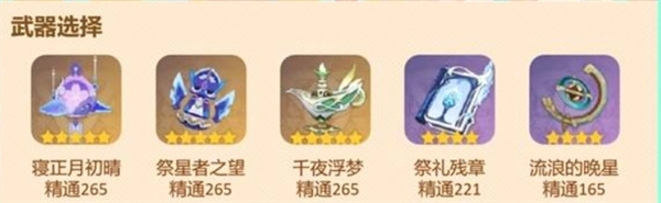 要是沒有五星武器,那么可以選擇四星武器中的「祭禮殘章」,它能提供技能刷新的機會,提升技能的覆蓋率;而「流浪的晚星」更適合偏向輔助定位的角色,它同時具備元素精通加成以及隊伍增益效果。