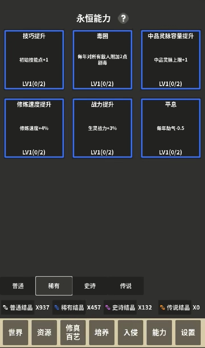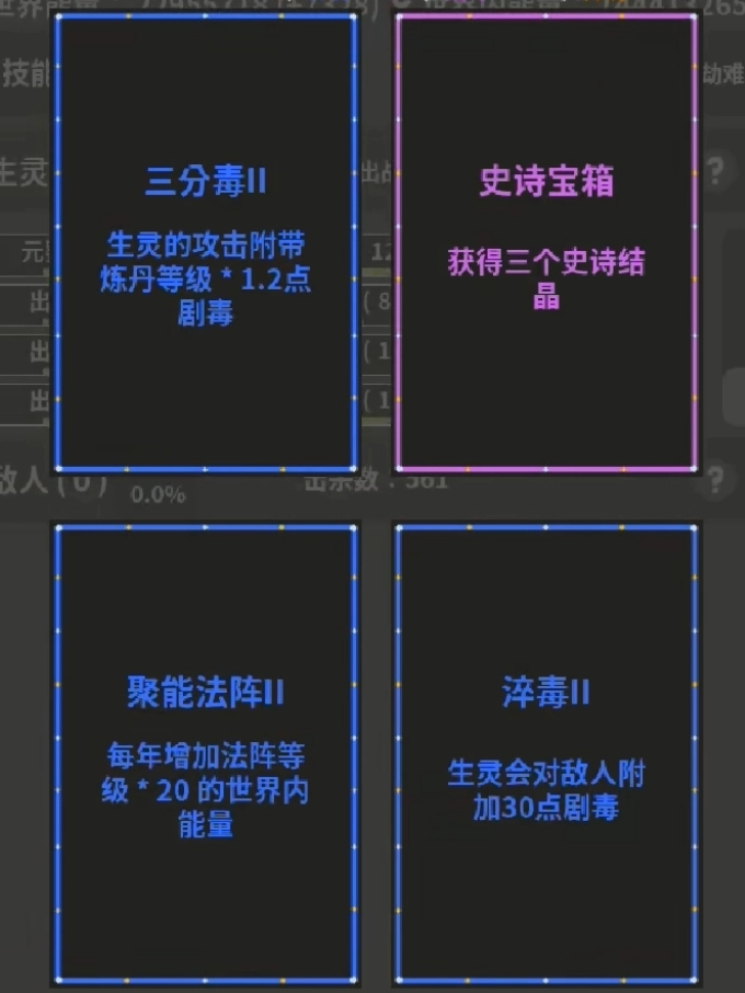 剛開始若出現藍色技能點,就點擊它,然后前往技能處選擇虛空吸取。偶爾點擊一些靈石礦,把修真百藝點開啟。全部一鍵確定之后,就無需再理會。后續要是出現諸如淬毒、三分毒、尸爆、毒圈這類毒詞條,都可以點擊,若有虛空基數則優先點選,以維持世界能量持續增長。