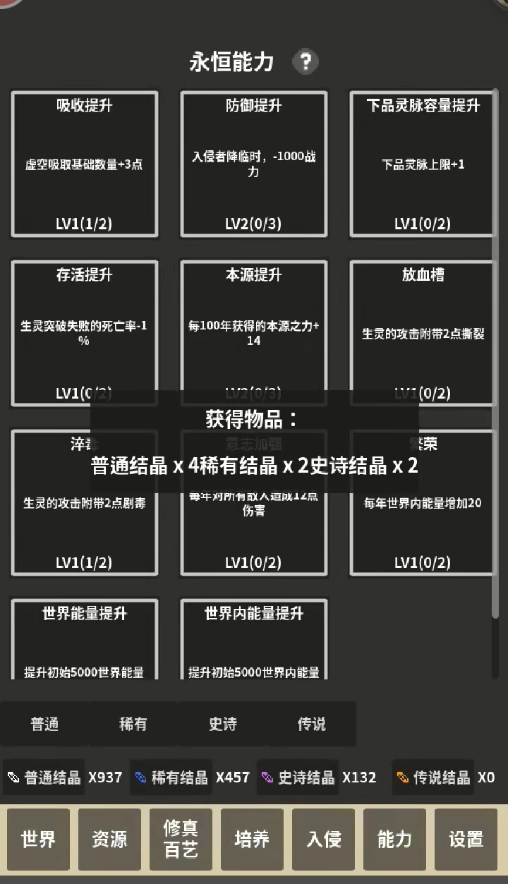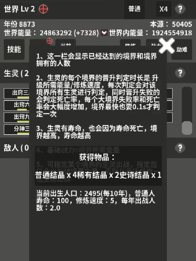 本篇為大家送上《修真世界模擬器》新手簡易攻略,帶你踏上無敵毒神之路。進入游戲后,先看完新手引導,熟悉一下功能屬性。需要注意的是,一旦游戲世界能量清零,游戲便會結束,因此要始終讓世界能量保持增長,千萬別讓它變成負數。
