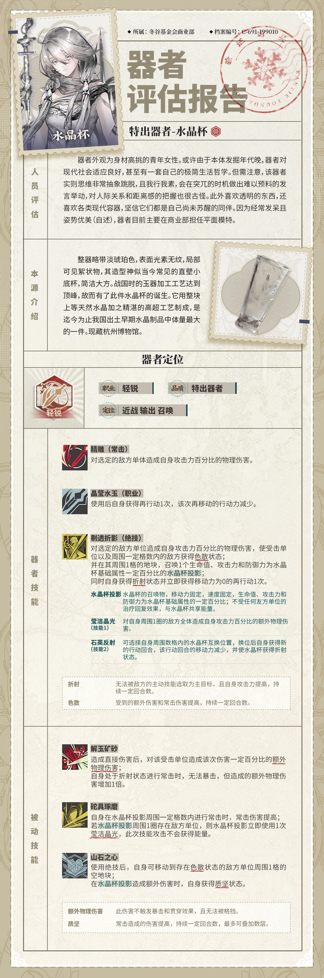 在物華彌新這個游戲設(shè)定里,水晶杯屬于召喚系角色。要是選擇召喚流玩法,她組隊適配性很強,不挑隊友。然而,這個角色并沒有特別突出的優(yōu)勢。抽取建議是,至少獲取一只角色本體。要是條件允許,不妨嘗試沖擊三致知。要是資源有限,跳過這個角色的抽取池子,也不會造成太大影響。