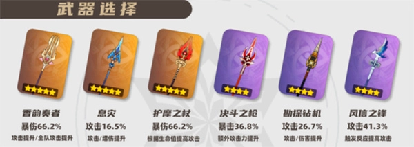護摩之杖(胡桃專屬武器):增強生存與攻擊方面的能力,不過要留意暴擊率與暴擊傷害的匹配情況。