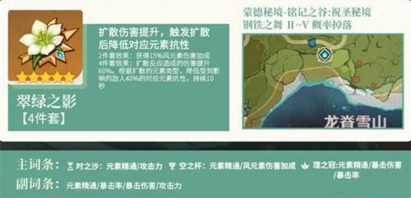 翠綠之影堪稱幾乎所有風(fēng)系輔助角色的核心套裝,伊法自然也在此列。不管是與火、冰、水、雷隊(duì)友協(xié)同實(shí)現(xiàn)減抗,還是自身施展擴(kuò)散AOE,都能夠大幅提升隊(duì)伍的整體輸出效率。