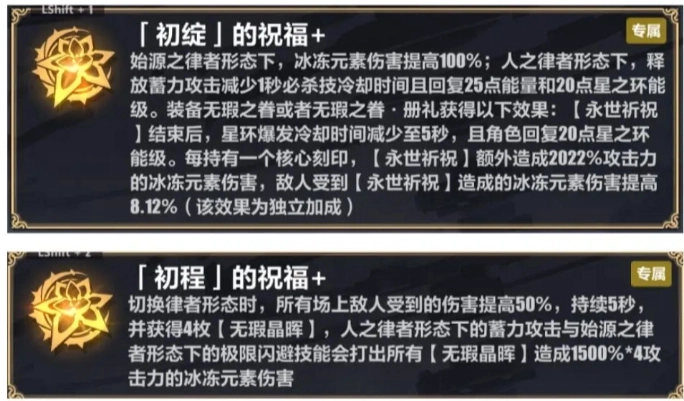 在始源之律者形態時,冰凍元素傷害提升10D% ;處于人之律者形態下,釋放蓄力攻擊可減少秒必殺技冷卻時間,同時回復25點能量與20點星之環能級。當裝備無瑕之眷或無瑕之眷·冊禮,能獲得以下效果:【永世祈祝】結束后,星環爆發冷卻時間縮短至5秒,角色還會回復20點星之環能級。每擁有一個核心刻印,【永世祈祝】額外造成相當于2025%攻擊力的冰凍元素傷害,敵人受到【永世祈祝】所造成的冰凍元素傷害提升8.12%(此效果為獨立加成)。