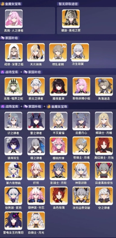 目前,人律沒有直接獲取角色卡的途徑。在金魔女商店以及補給商店(輪替更為頻繁)中,只能獲取晉升印章。消耗60抽的星之鍵,能讓人律具備作為影隊輸出以及升變輔助的能力。對于BOX較窄的玩家來說,用人律湊隊伍性價比相對較高,而且人律自身也具備一定強度。所以在某些情形下,其兌換價值較高。