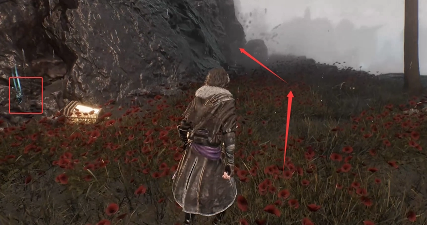 進入之后,在左手邊能看到一個符紋,記得收集起來,接著從右邊的懸崖通道向前行進。