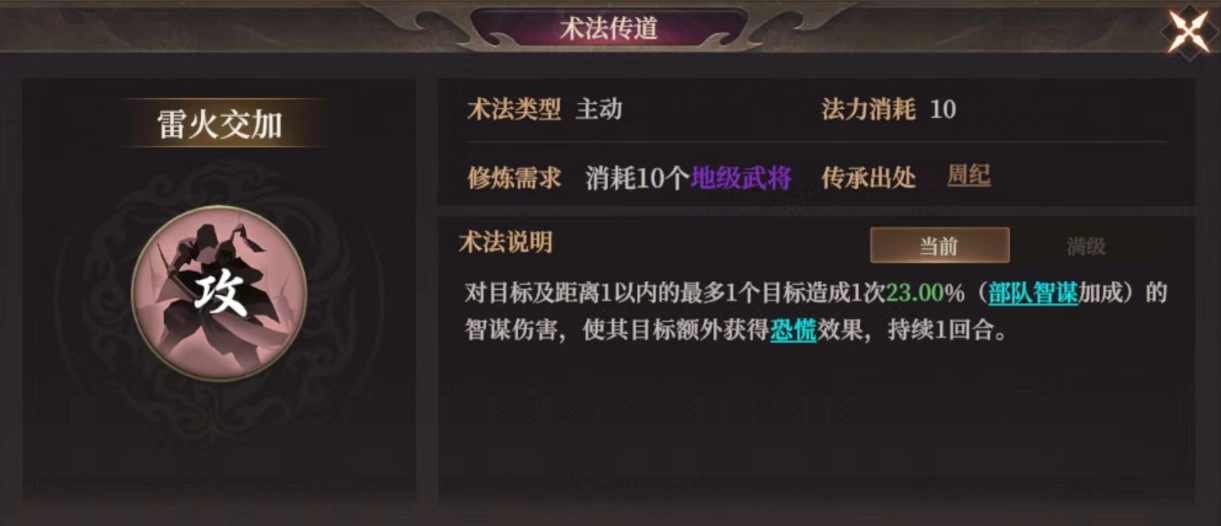 對目標(biāo)以及距離該目標(biāo)1以內(nèi)的至多1個目標(biāo),造成1次等同于23.00%(受部隊智謀加成影響)智謀的傷害,并讓這些目標(biāo)額外獲得恐慌效果,該效果持續(xù)1回合。
