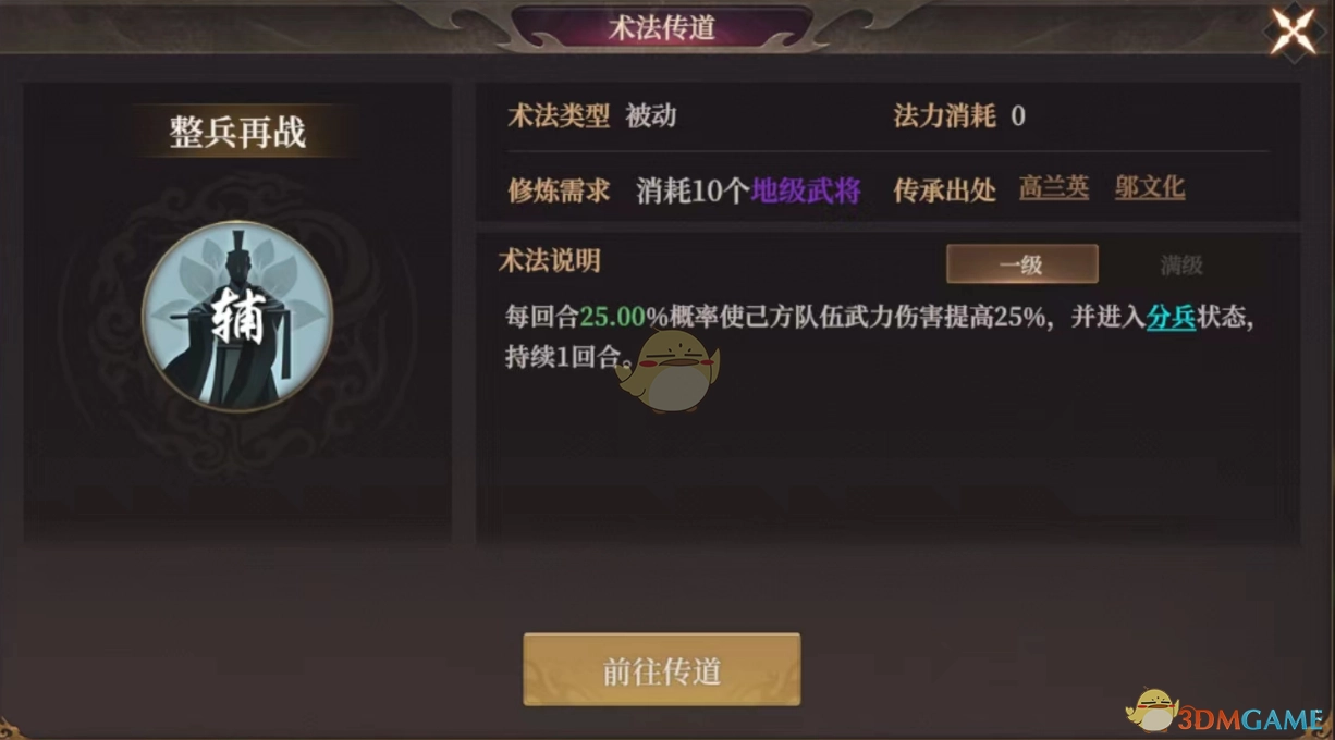 每個回合都有25.00%的幾率,讓己方隊伍的武力傷害提升25%,同時進入分兵狀態,該狀態維持1回合。