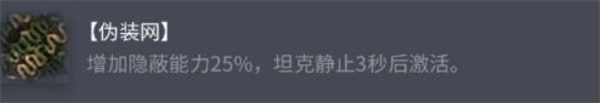 1. 偽裝網(wǎng)(具備 +25% 的隱蔽效果,在靜止?fàn)顟B(tài)下激活)