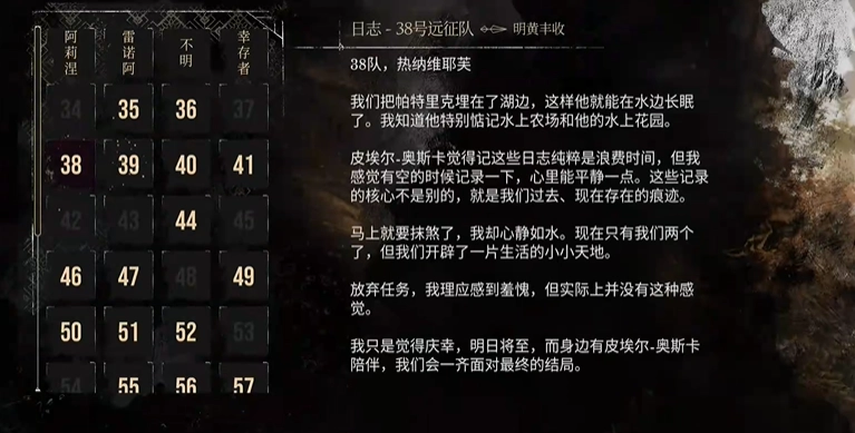光與影33號遠征隊全日志收集攻略,本篇主要分享38號遠征隊日志的位置。該日志處于黃明豐收區域,此區域位于大陸地圖的中間部分,且與刷頭村處于同一個版塊。