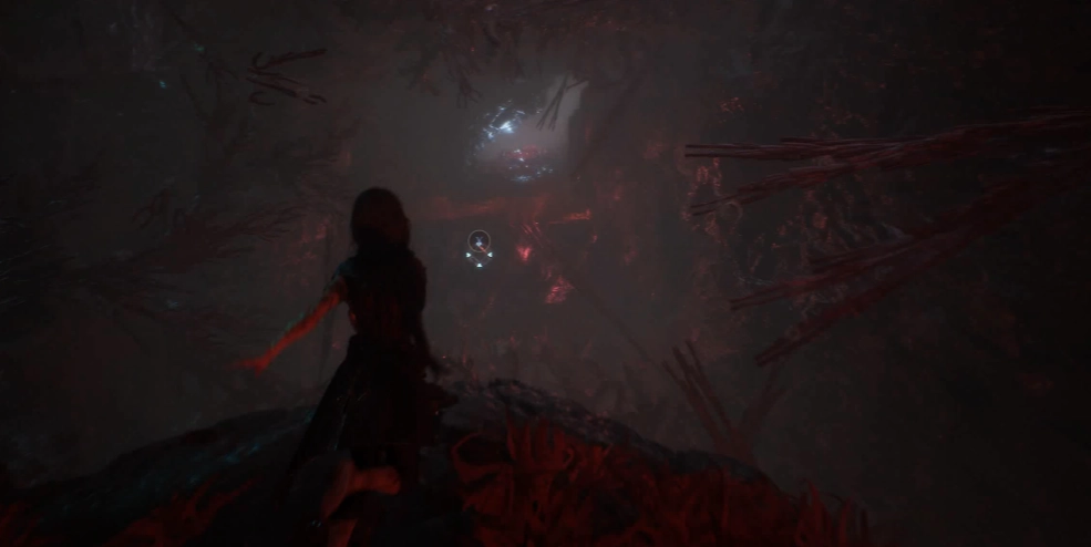 繼續向前行進,一路上清理遇到的怪物,抵達下方這條裂縫處,往裂縫邊緣稍微走動一些,會出現鉤索提示,借助鉤索前往對面。