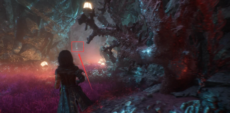 繼續向前,經過兩個鉤索后到達下圖所示位置,此時前方無路。抬頭看向山壁,借助上面的借力點攀爬上去。