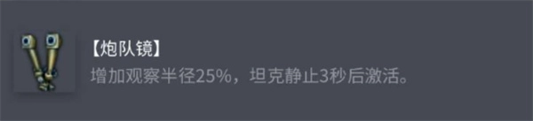 盡管提升幅度比不上炮隊鏡(僅為10%),然而其優勢在于移動過程中同樣能夠發揮作用,適用于邊偵察邊進行走位的打法,觀察半徑最大能夠提升到500米。