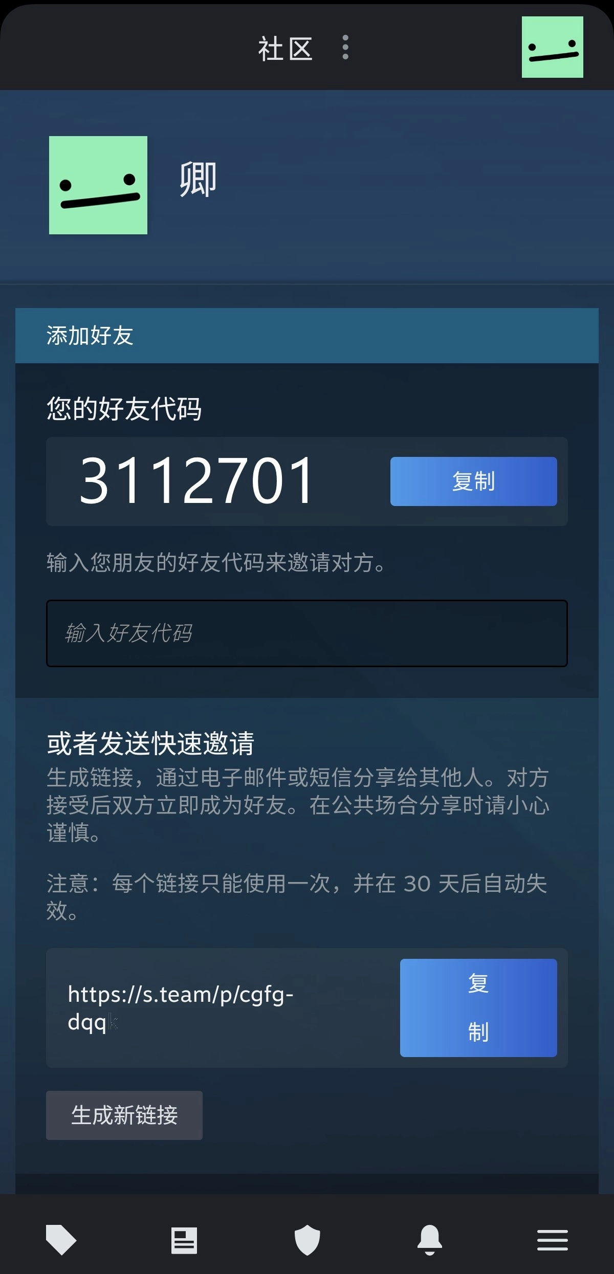 3、你可以把自己的好友碼復(fù)制給他人,方便他們添加你。若要添加好友,在下方輸入好友代碼即可。另外,下方還有快速邀請鏈接,復(fù)制后發(fā)送給好友,好友點(diǎn)擊該鏈接就能添加你。