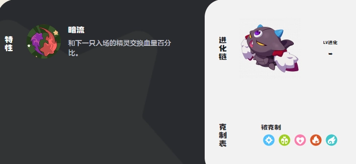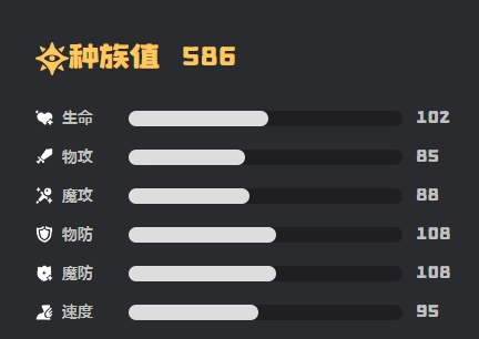 從種族數值上看,總和為586 ,其中速度95,物理防御108 ,物理攻擊85 ,生命值102 。它能夠與下一只入場的精靈直接進行交換,以血量百分比計算。其進化鏈相對較為簡單,可直接從瑰眼仔起步,逐步進化。在屬性克制關系上,該精靈會受到火系與光系的克制,但對草系和龍系能產生有效抵抗。