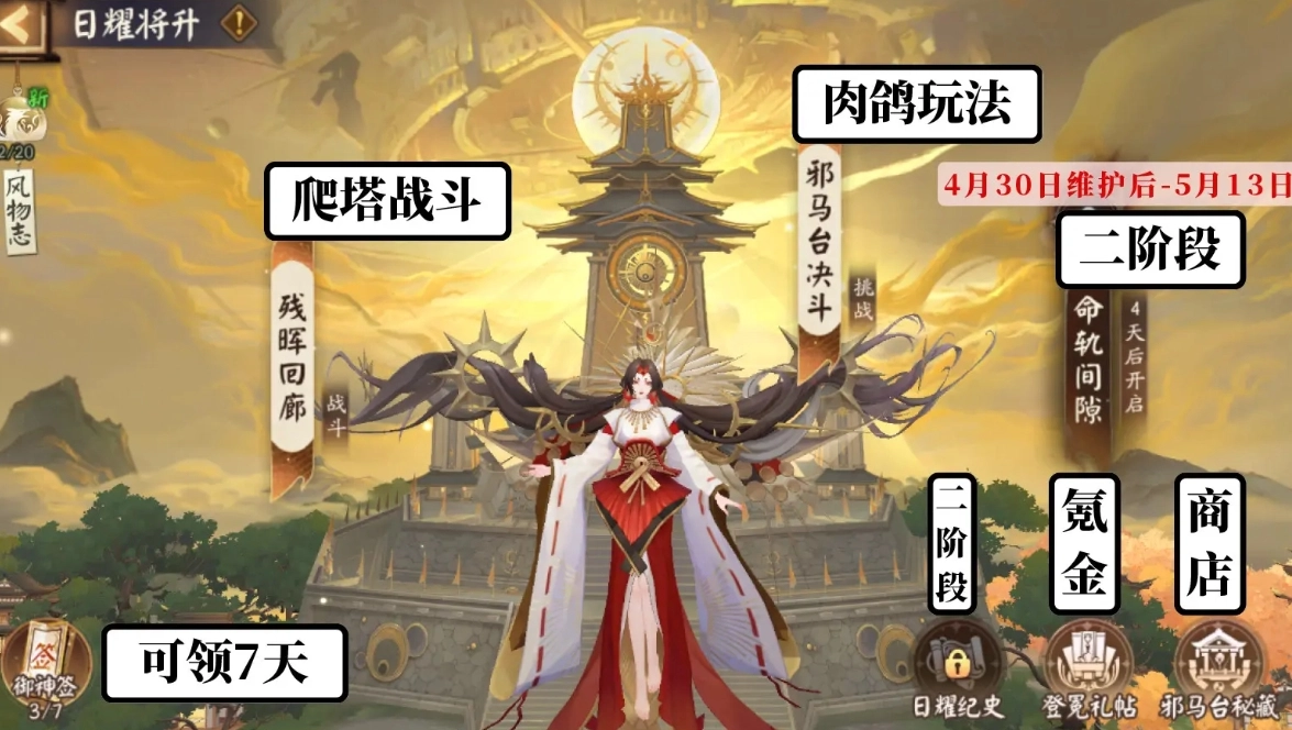 《陰陽師》迎來全新版本活動“日耀將升”,此乃卑彌呼的伴生活動?;顒雍w多種不同玩法,且分為兩個階段,會一直持續至5月13日。