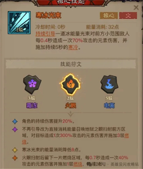 寒冰光束 - 火眼:作為主力輸出技能,能迅速疊加燃燒層數,進而觸發高頻灼燒傷害。