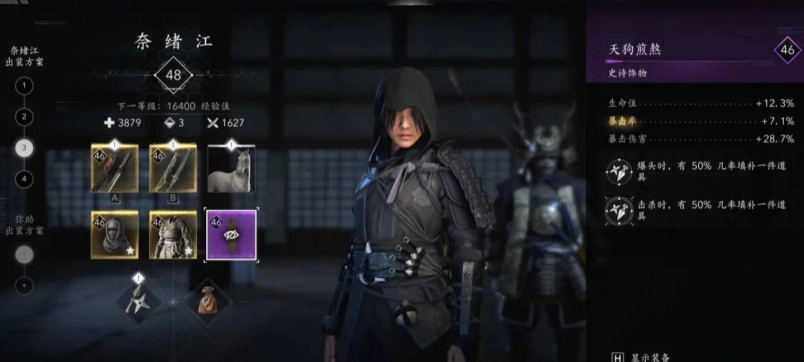 本篇要給大家分享的是《刺客信條:影》中奈緒江的無限飛刀流配裝。此流派的關鍵要素在于帽子、輕甲以及飾物,其中特別需要一個紫色飾物。