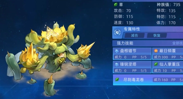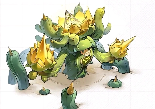 盡管參天巨型仙人掌的種族值總和尚未公布確切數據,但從它在對戰中的表現以及草系精靈的普遍特性判斷,其具備一些顯著特點。在體力方面,推測較為出色,這為它在對戰中奠定了一定的生存基礎,使其不會輕易被對手的攻擊打敗。草系精靈一般在特攻上有著良好的成長,參天巨型仙人掌同樣如此,特攻屬性讓它在特殊攻擊方面蘊含較大潛力,搭配一系列草系特攻技能,能夠對敵方造成相當可觀的傷害。在防御與特防方面,雖然不算極為突出,但在面對物攻和特攻型對手時,仍能提供一定抗性,保證自身在戰斗中的穩定性。而速度方面,可能相對較慢,這就意味著它在對戰中的出手順序策略,更多要借助技能機制來加以彌補。