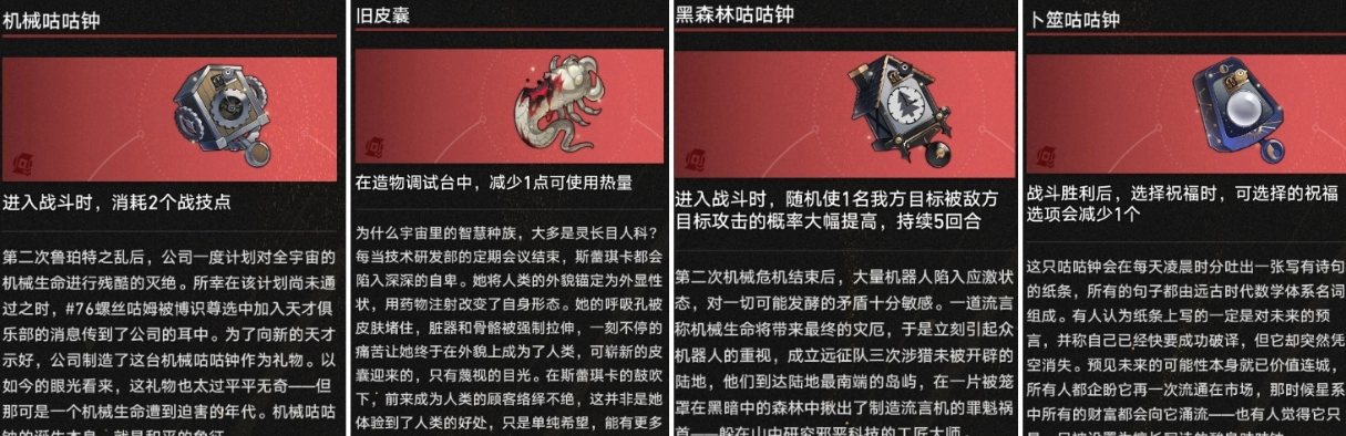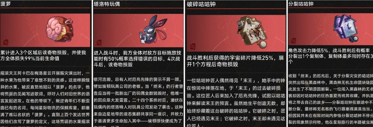 由于需要從17個負面奇物中三選一,碰到這些負面奇物時就可以進行選擇。鑒于遐蝶的隊伍不存在攻擊力依賴問題,也不擔心暴斃情況,同時戰技點充裕且戰斗次數較少,所以只要不是對經濟影響極大的負面奇物,都在可選范圍內。