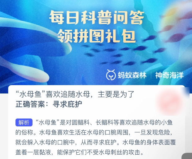 2025年5月23日,支付寶螞蟻森林神奇海洋的問題更新啦。今日題目為:“水母魚”喜歡追隨水母,主要是為了什么?正確答案是:【尋求庇護】。水母魚偏好生活在水母的口腕周邊,一旦察覺到危險,便會迅速躲進水母的口腕之中,以此尋求庇護。