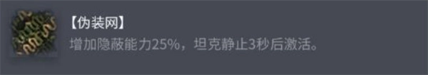 效果:使隱蔽能力提升25%,坦克靜止達(dá)3秒后此效果激活。