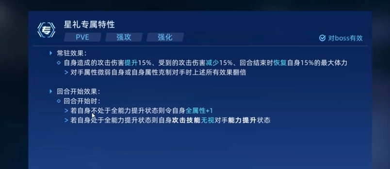 星禮的魂印效果設計蘊含著極高的策略價值。在基礎方面,它給予傷害提升、減傷以及回合結束時回血這三重保障。而只要進入屬性克制或者被克制的狀態,所有效果都會翻倍。這樣的機制讓星禮在優勢屬性的對戰中更加強勁,即便處于劣勢對局,也能夠實現反向壓制,達成戰術上的錯位。進階魂印更是賦予了星禮開局自動強化,以及攻擊時無視對手強化狀態的特性。