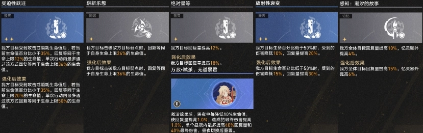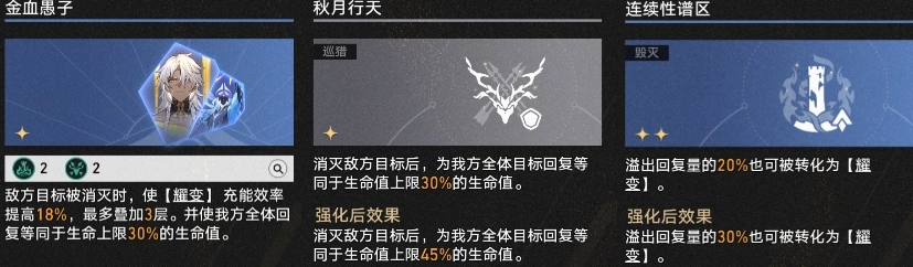 接下來,當死龍結束回合時,若成功擊殺敵人,一星方程【金血愚子】以及【巡獵】的一星擊殺回血祝福便會生效——它們會產生大量的溢出回復量,在配備二星祝福【連續(xù)性譜區(qū)】后,能為【耀變】提供可觀的充能。當這些祝福與方程全部激活或升級后,所提供的【耀變】充能量大致能接近【懸鋒伙友】或【逐火同盟】,并且【金血愚子】自身還具備【耀變】充能加速效果。