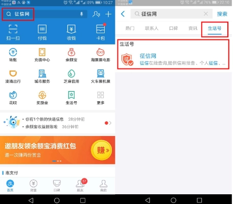 1. 第一步,打開支付寶APP,在搜索框中輸入“征信網”,切換至生活號選項卡,然后點擊關注“征信網”。