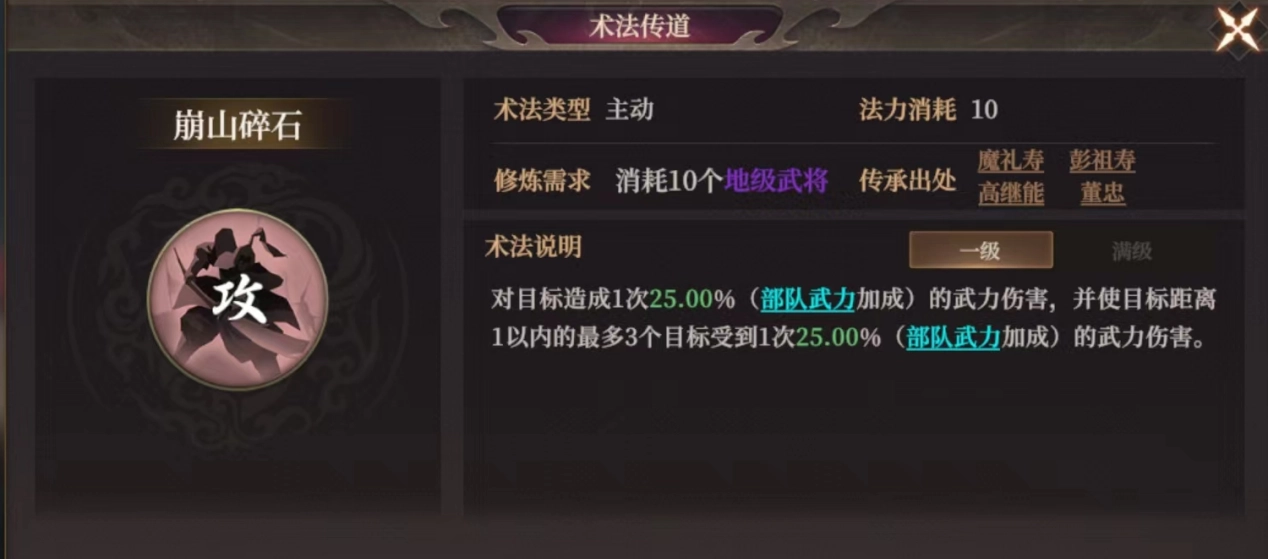 對目標造成一次武力傷害,傷害量為25.00%(受部隊武力加成影響),同時讓距離該目標1以內的最多3個目標,也受到一次武力傷害,此次傷害量同樣為25.00%(受部隊武力加成影響) 。