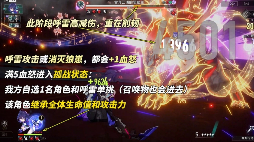 ①孤戰規則。呼雷無論是攻擊還是消滅狼崽,都能提升1層嗜血。當嗜血達到滿5層時,呼雷便會開啟孤戰模式,此時我方可以自主挑選1位角色與呼雷進行單挑(憶靈或召喚物同樣會一同進入單挑場景),在單挑期間,所選角色將繼承全隊的生命值與攻擊力(光環增益仍然有效)。