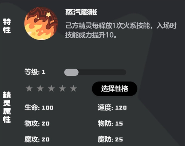 種族值相關數據如下:生命數值為100 ,速度數值為120 ,物理攻擊力數值為20 ,魔法攻擊力數值為20 ,物理防御力數值為15 ,魔法防御力數值為25 。