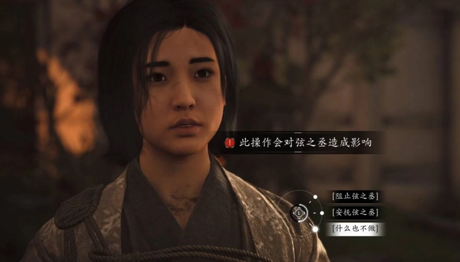 在成功擊敗辰五郎之后,若能對弦之丞進行阻止或者安撫,他便會選擇加入,成為你的盟友。然而,要是你選擇不采取任何行動,又或者是等待倒計時結束,那么弦之丞將會選擇炸死自己。