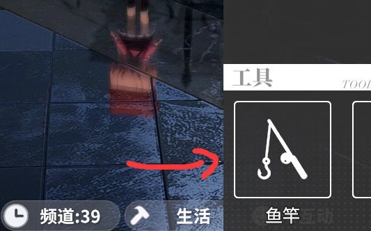 接著,點開屏幕下方的互動選項,于右下角裝備好釣竿,前往一處有水的地方,挑選合適的魚餌,便可開啟釣魚之旅。