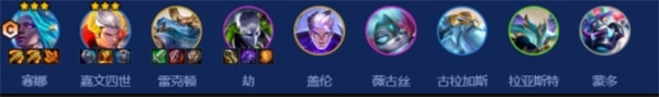 棋子包含:賽娜、嘉文四世(皇子)、雷克頓(鱷魚)、劫、蓋倫、薇古絲、酒桶、拉亞斯特以及蒙多醫生。