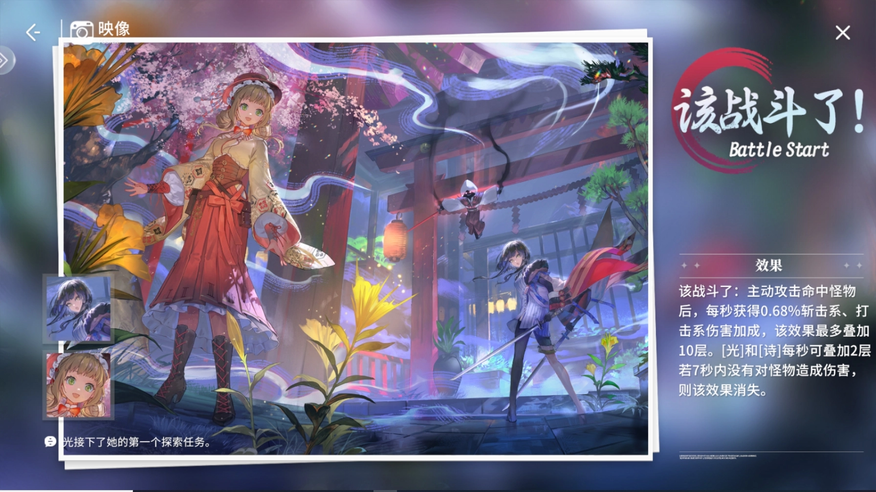 初級效果:當主動攻擊成功命中怪物后,每秒鐘會獲取0.68%的斬擊系與打擊系傷害加成。此效果最高能疊加至10層。其中,[光]與[詩]每秒能夠疊加2層。要是在7秒的時間內,未能對怪物造成傷害,那么該效果就會消失。