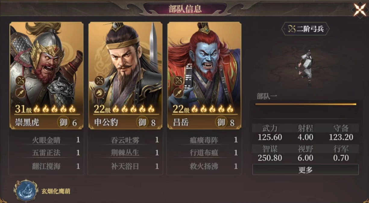 本篇為大家送上《封神:開天》中呂岳的陣容搭配推薦:崇黑虎 + 申公豹 + 呂岳。要是沒有崇黑虎,可用姬發替換,姬發是弓兵,加點全部選擇智謀。當面對單體目標時,可以讓崇黑虎擔任主將,呂岳和申公豹借助靈寶疊加弱水層數,接著崇黑虎發動自身自帶的術法火眼金睛,消耗掉所有的弱水,進而造成最高可達 460%的智謀傷害。