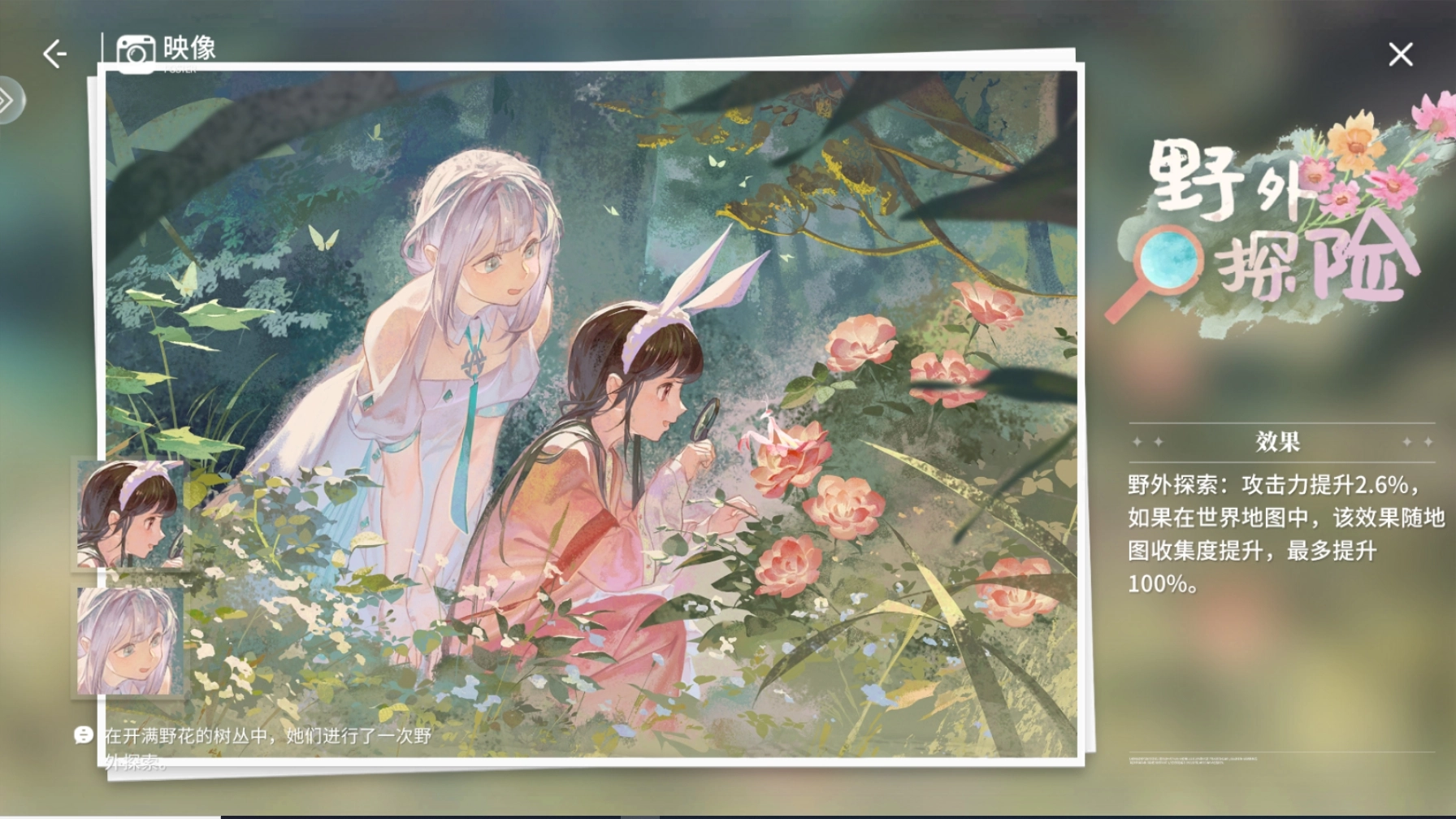 初級效果為:攻擊力提升2.6%。當處于世界地圖時,此效果會依據地圖收集度而提升,最高可提升至100%。