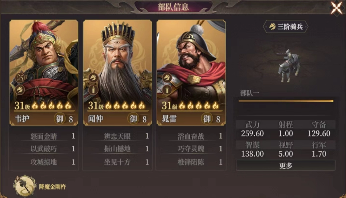 韋護、聞仲與晁雷所組成的,正是群英獻禮中的太師騎,這是一套以追求極致爆發(fā)為目標的騎兵陣容。無論是韋護還是聞仲,都能夠擔當主將一職,原因在于他們所擁有的靈寶,都具備提升全隊武力傷害以及增加庚金層數(shù)的功效。