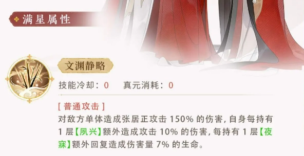 張居正的普通攻擊名為“文淵靜略”,乍一看,它不過是個相對常規的單體傷害技能,基礎倍率為150%。然而,其獨特之處在于與張居正獨有的雙狀態系統緊密相連:每擁有一層【夙興】,便會附加10%的額外傷害。而每一層【夜寐】,則能夠恢復傷害量7%的生命值。這種“在戰斗中兼顧輸出與自我恢復”的機制,讓張居正在輸出的過程中,擁有了一定的自我續航能力,在中長線戰斗里優勢盡顯。