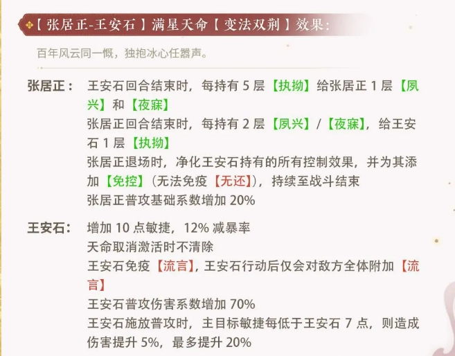 另外,當張居正在與兩位特定角色進行搭配時,能夠獲取十分顯著的協同增益效果。其中,與戚繼光所產生的天命加成,重點突出的是聯動輸出以及狀態強化方面。戚繼光的技能能夠觸發【謀眾】,并且延長該效果的持續時間,而且在觸發之后不會再移除【夙興】,如此一來,張居正的傷害機制不僅得以保留,還能進一步得到強化。與此同時,在特定狀態下,張居正與戚繼光雙方都能免疫【繳械】,戚繼光還可以額外獲得群體傷害的提升以及固定系數的調整,這一系列效果綜合起來,讓這個組合具備了極強的爆發力與穩定性。
