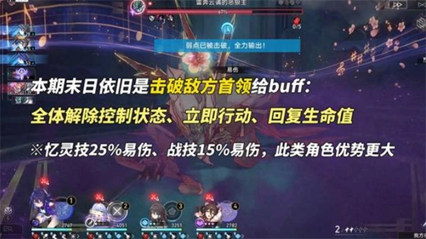 本輪幻影著重推出【快速擊破】機制,在成功擊破Boss的瞬間,我方全體成員不僅會解除控制狀態,還能立即獲得行動機會,同時回復生命值。借助環境增益效果,多數陣容可以放棄生存位的配置,全力堆疊輸出,以暴力方式通關。