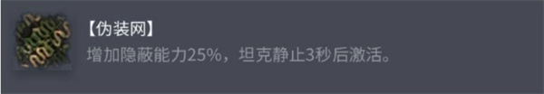 觸發效果:當坦克處于靜止狀態持續3秒后,該效果激活,為坦克提供額外25%的隱蔽加成。