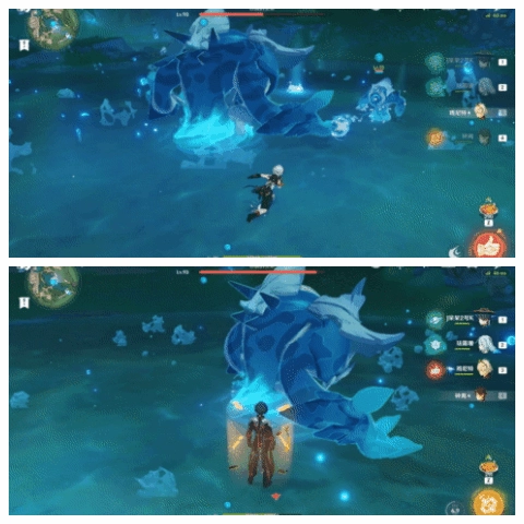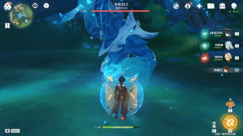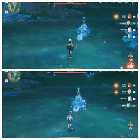 因此,更推薦采用元素反應。火、冰、風、巖、雷、草皆能與水產生反應,而半幻人僅擁有1單位水元素,所以此刻角色憑借任意的火、冰、草、雷附著攻擊,皆可瞬間將其擊潰。