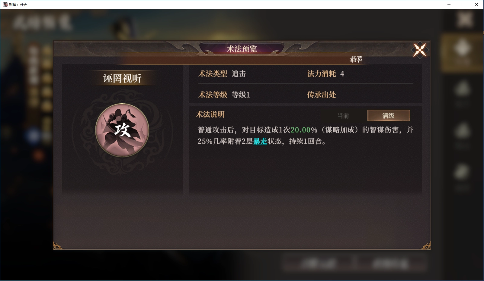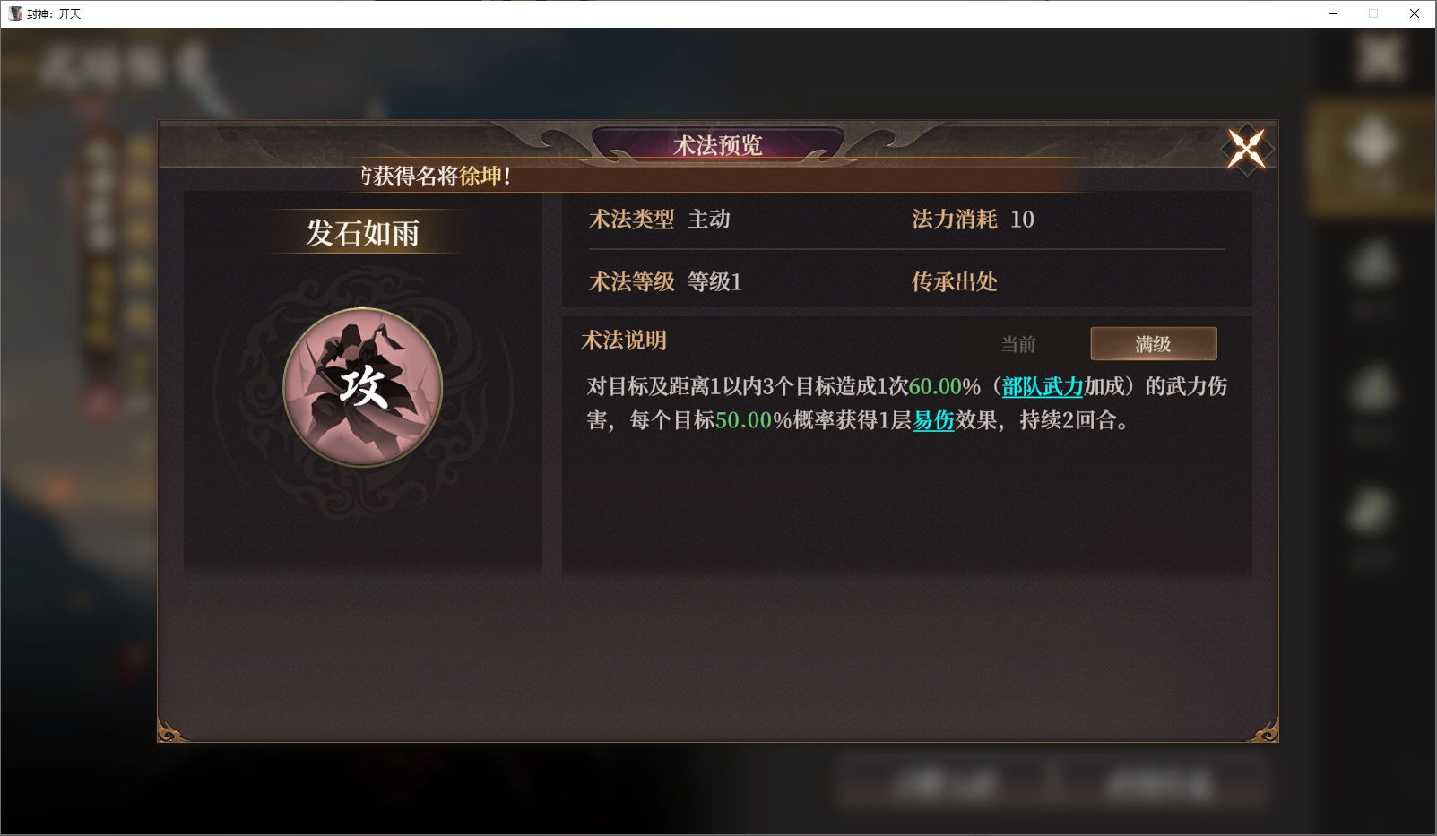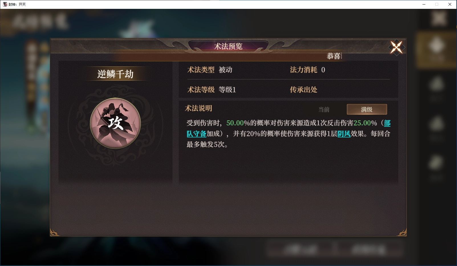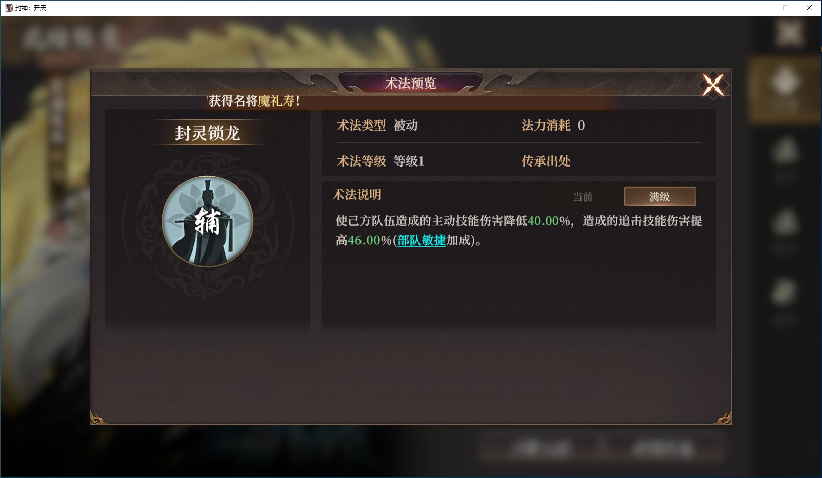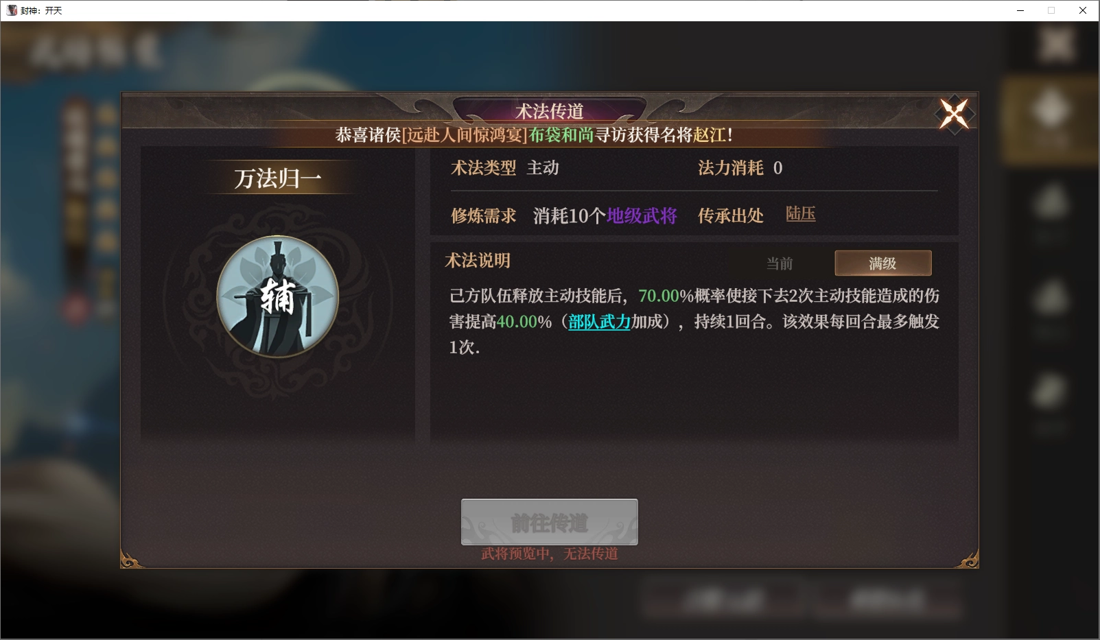 萬法歸一(陸壓):此為增傷技能,可主動輔助,提升40%武力傷害